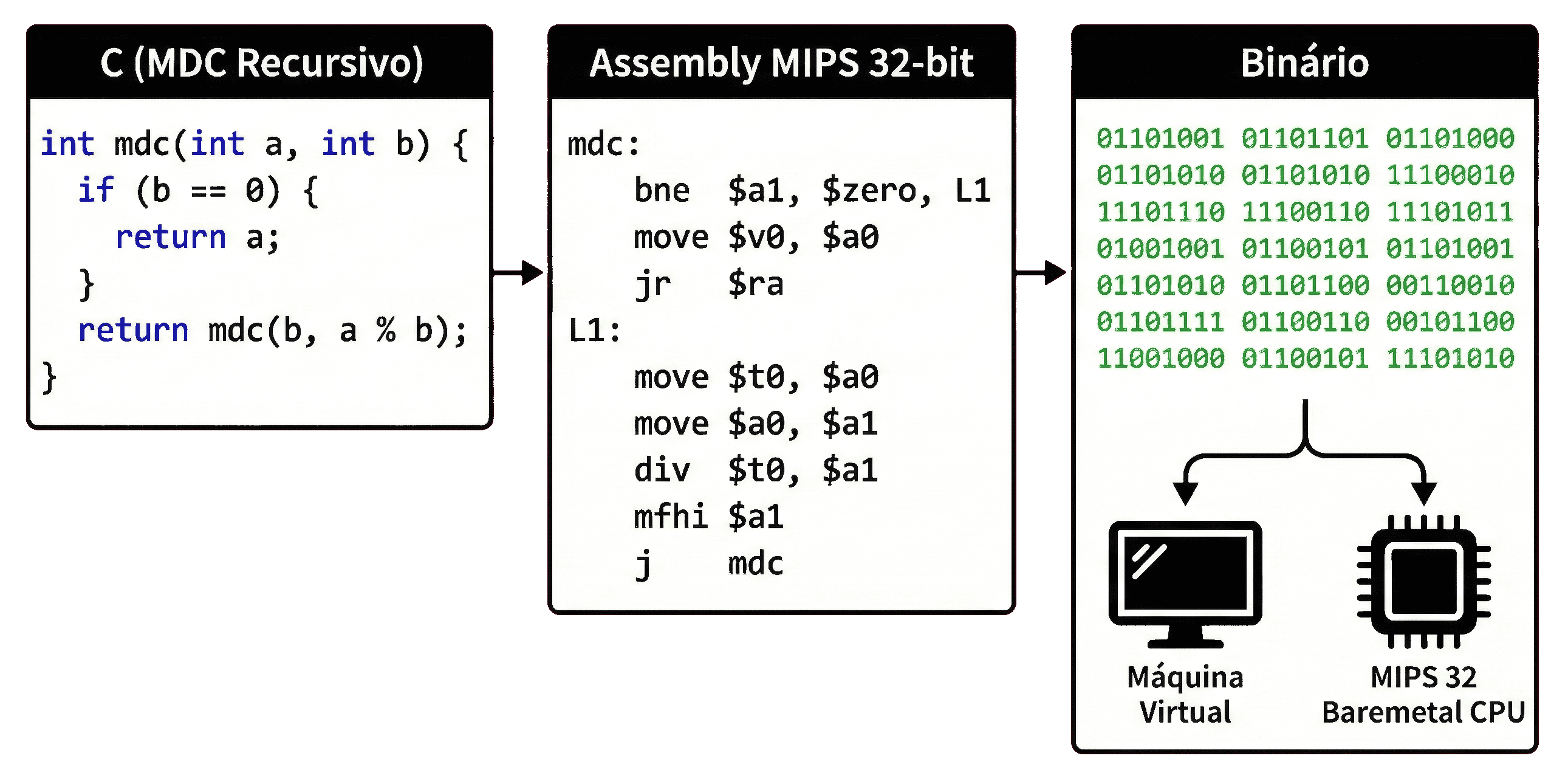 Modernamente, essa conversão raramente ocorre de maneira direta. O processo é estruturado em uma linha de produção lógica: o código fonte é primeiramente traduzido para uma Linguagem Intermediária (IR - Intermediate Language), que é uma representação padronizada e independente de hardware. Em seguida, essa representação é convertida para a linguagem de montagem (assembly) específica da arquitetura alvo (como x86 ou MIPS). Por fim, um montador converte as instruções textuais do assembly para os bits do código de máquina. Portanto, o assembly serve apenas como uma interface textual legível para os binários que a CPU efetivamente processa.