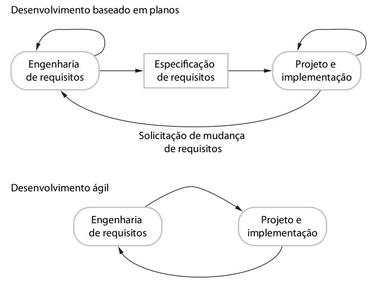 As abordagens ágeis e as dirigidas a planos diferem fundamentalmente na forma como estruturam as atividades. Enquanto o ágil considera o projeto e a implementação como atividades centrais, incorporando elicitação de requisitos e testes nesse fluxo contínuo, a abordagem dirigida a planos identifica estágios distintos, onde a saída documental de uma fase serve de base para o planejamento da próxima. Essa distinção, onde o modelo dirigido a planos comunica-se via documentos formais e o ágil itera requisitos e projeto conjuntamente, é ilustrada na figura abaixo: