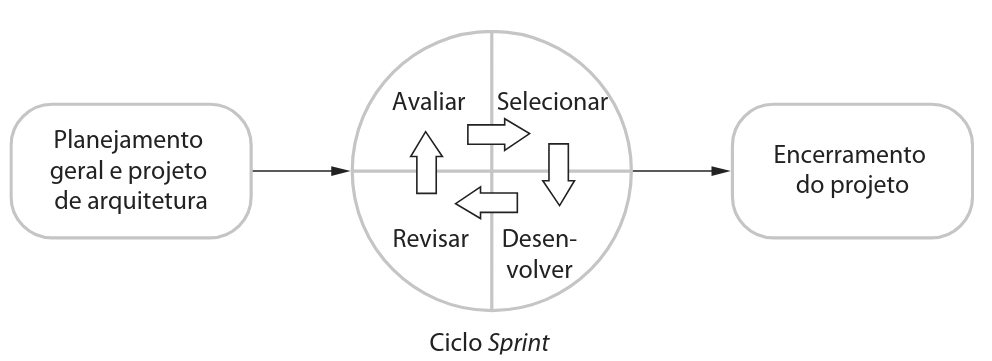 O ciclo de vida no Scrum divide-se fundamentalmente em três fases. A primeira consiste no planejamento geral, onde se definem os objetivos e a arquitetura do software. A segunda fase é composta por ciclos de sprint, onde ocorre o desenvolvimento incremental do sistema. Por fim, a fase de encerramento completa a documentação e avalia as lições aprendidas. A grande inovação do Scrum reside justamente na sua fase central, os sprints, que são unidades de planejamento onde o trabalho é avaliado, selecionado e implementado.
