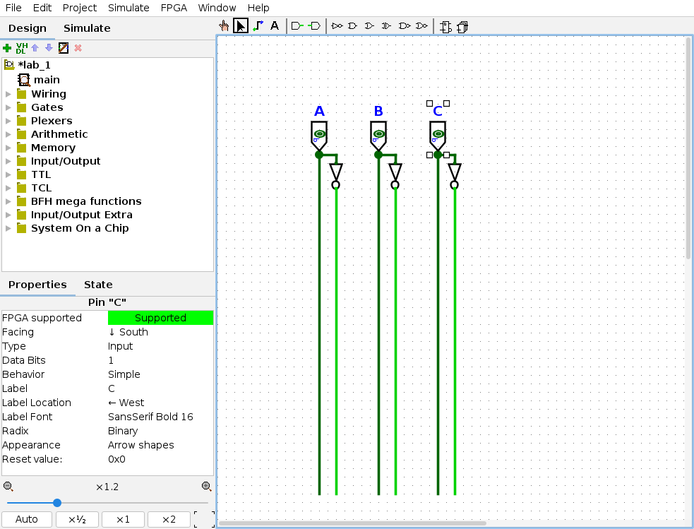 - Insira 3 entradas no topo da tela ($A, B, C$) e mude a propriedade Facing para South (Sul).