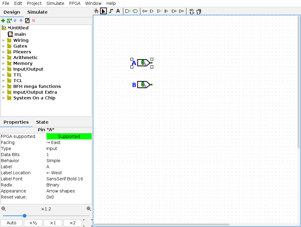 Inserção: Na barra de ferramentas, clique no ícone do Input Pin e clique no Canvas para criar uma entrada, faça isso duas vezes para termos duas entradas distintas.