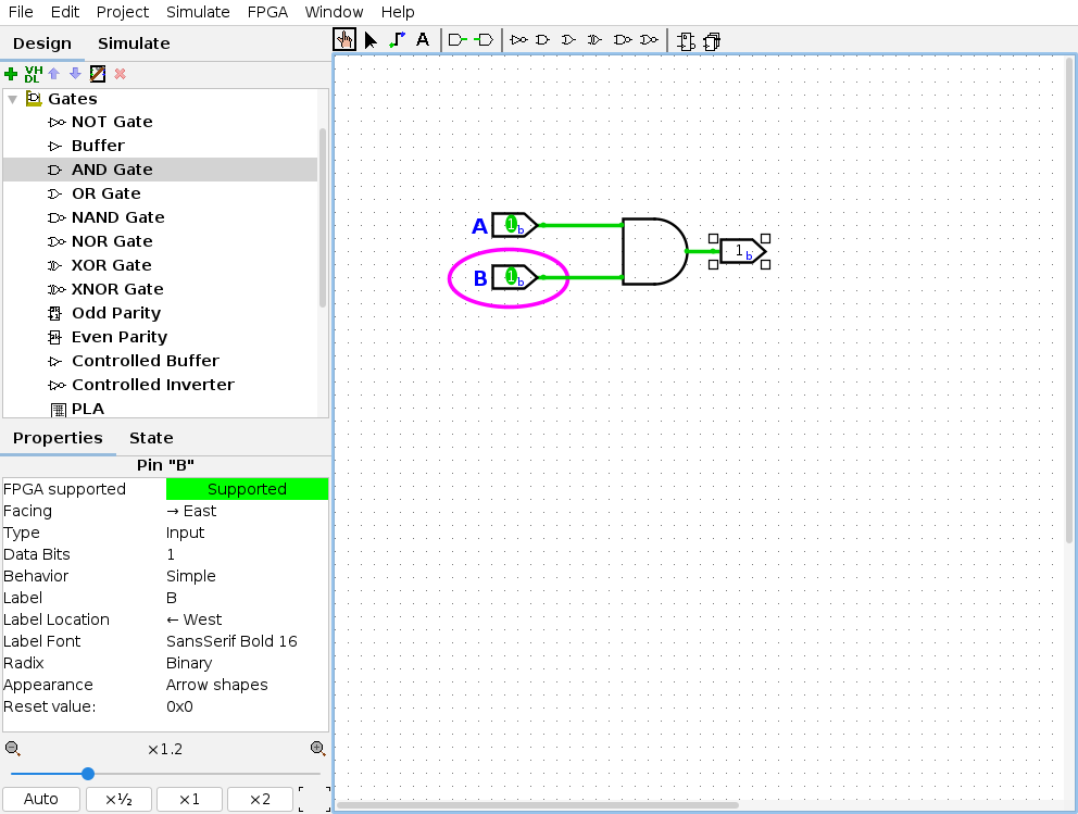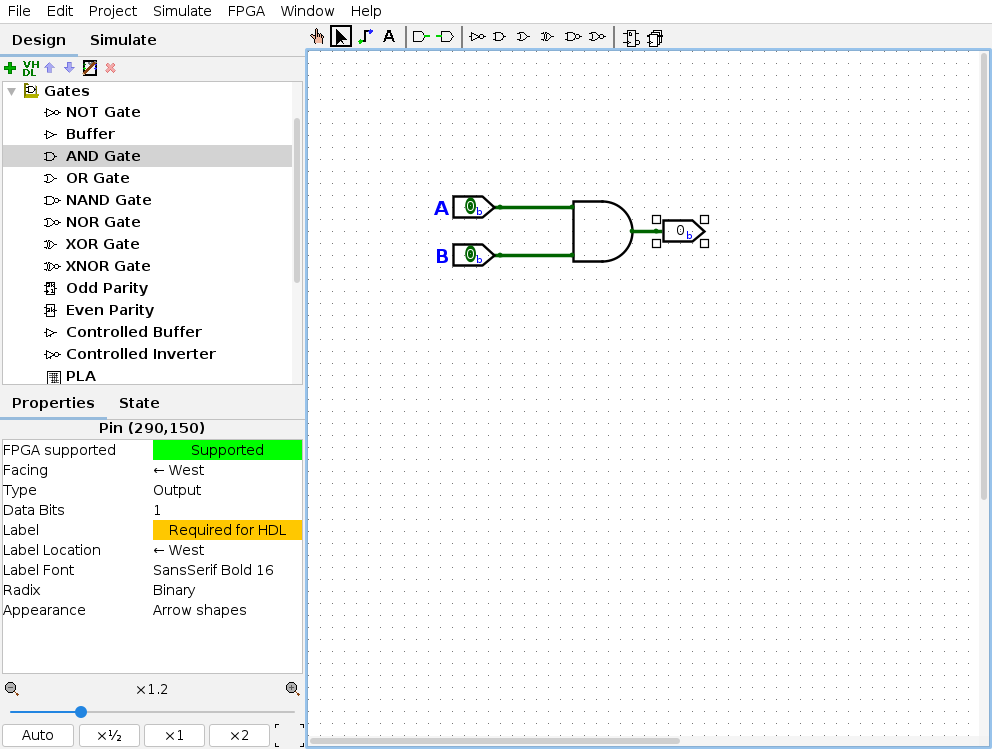 Saída: Insira um Output Pin e conecte-o à saída da porta AND.