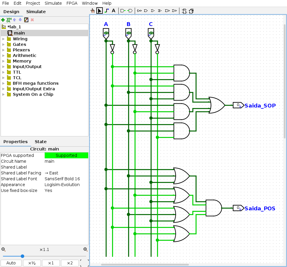 Implemente usando 4 portas OR de 3 entradas. Conecte as saídas dessas portas OR em uma única porta AND final. Nomeie a saída como Saida_POS. O resultado final deve ser algo parecido com à imagem abaixo: