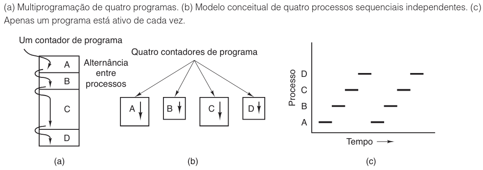 Ao analisar a imagem acima, observamos em (a) um computador multiprogramando quatro programas na memória. Em (b), vemos quatro processos, cada um com seu próprio contador de programa lógico e fluxo de controle, sendo executados independentemente. Embora exista apenas um contador de programa físico, seu valor é salvo no contador lógico do processo na memória sempre que a execução é interrompida e restaurado quando ela retorna. Em (c), nota-se que, ao longo do tempo, todos os processos progridem, embora apenas um esteja ativo em um dado instante.