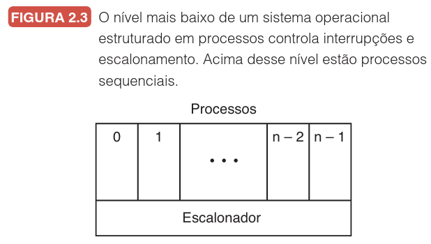 Essa abstração permite visualizar o sistema operacional em camadas. No nível mais baixo, temos o escalonador, que oculta os detalhes complexos de interrupções e gerenciamento de hardware (disco, fita, terminais). Acima dele, reside uma variedade de processos de usuário e de sistema.