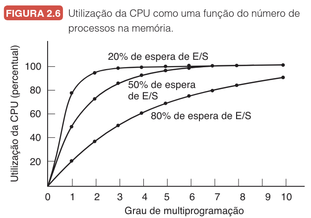 - d) Para os mesmos processos do item 'c' ($p=0,8$), quantos processos (n) são necessários, no mínimo, para garantir que a CPU fique ociosa menos de 10% do tempo? (Dica: Analise o gráfico da Figura 2.6 ou teste valores inteiros para $n$).