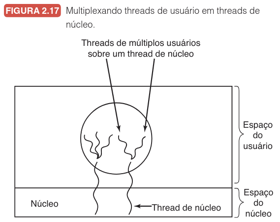 Este modelo, às vezes chamado de modelo m:n, permite que o desenvolvedor tenha o melhor de dois mundos: o chaveamento instantâneo entre threads de usuário quando não há bloqueios e a garantia de que o processo não paralisará completamente quando uma operação de sistema for necessária.