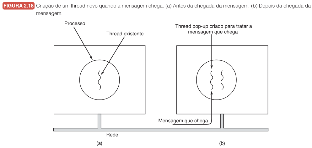 Em sistemas distribuídos, a eficiência no tratamento de mensagens e requisições de serviço é vital. A abordagem convencional utiliza um processo ou thread permanentemente bloqueado em uma chamada de sistema receive, aguardando a chegada de dados. No entanto, uma alternativa altamente eficiente para reduzir a latência de processamento é o uso de threads pop-up, onde a própria chegada de uma mensagem dispara a criação imediata de um novo fluxo de execução.