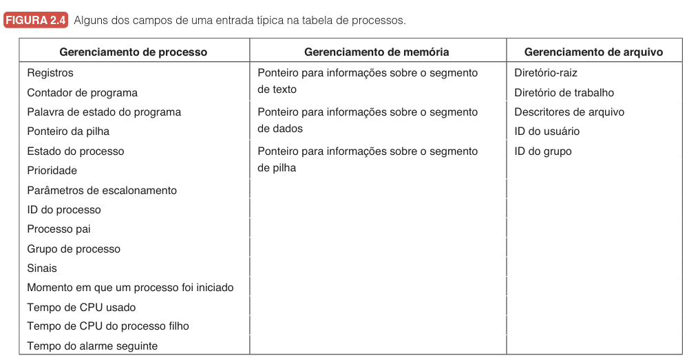 Para viabilizar o modelo de processos, o sistema operacional mantém uma estrutura de dados centralizada conhecida como tabela de processos, ou Bloco de Controle de Processos (PCB). Esta tabela funciona como um arranjo de registros onde cada entrada é dedicada a um processo específico, armazenando todos os dados necessários para que o sistema possa suspender sua execução e retomá-la posteriormente sem qualquer perda de continuidade.