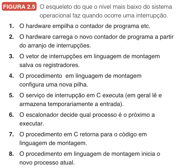 Conforme demonstrado na figura acima, quando ocorre uma interrupção (como a leitura de um disco concluída), o sistema não precisa lidar com "interrupções cruas" o tempo todo, mas sim gerenciar estados de processos. O processo que aguardava o disco (estado Bloqueado) é movido para o estado Pronto (transição 4), tornando-se elegível para execução novamente. Esse modelo transforma a complexidade do hardware em um fluxo lógico de processos bloqueando e desbloqueando.